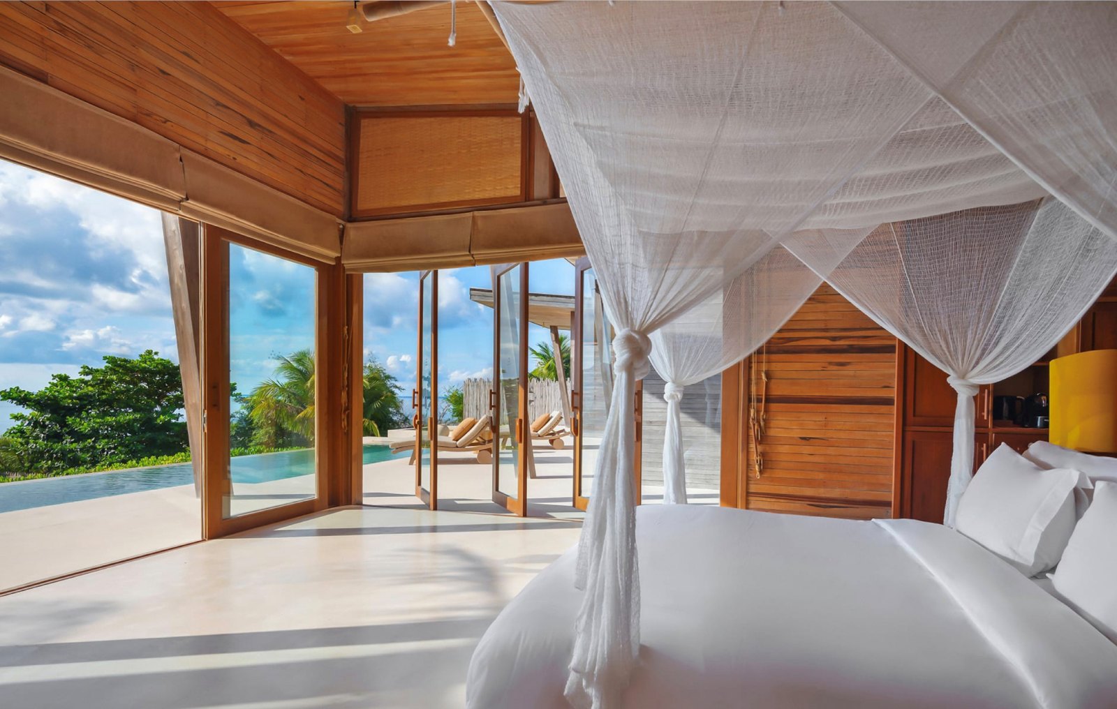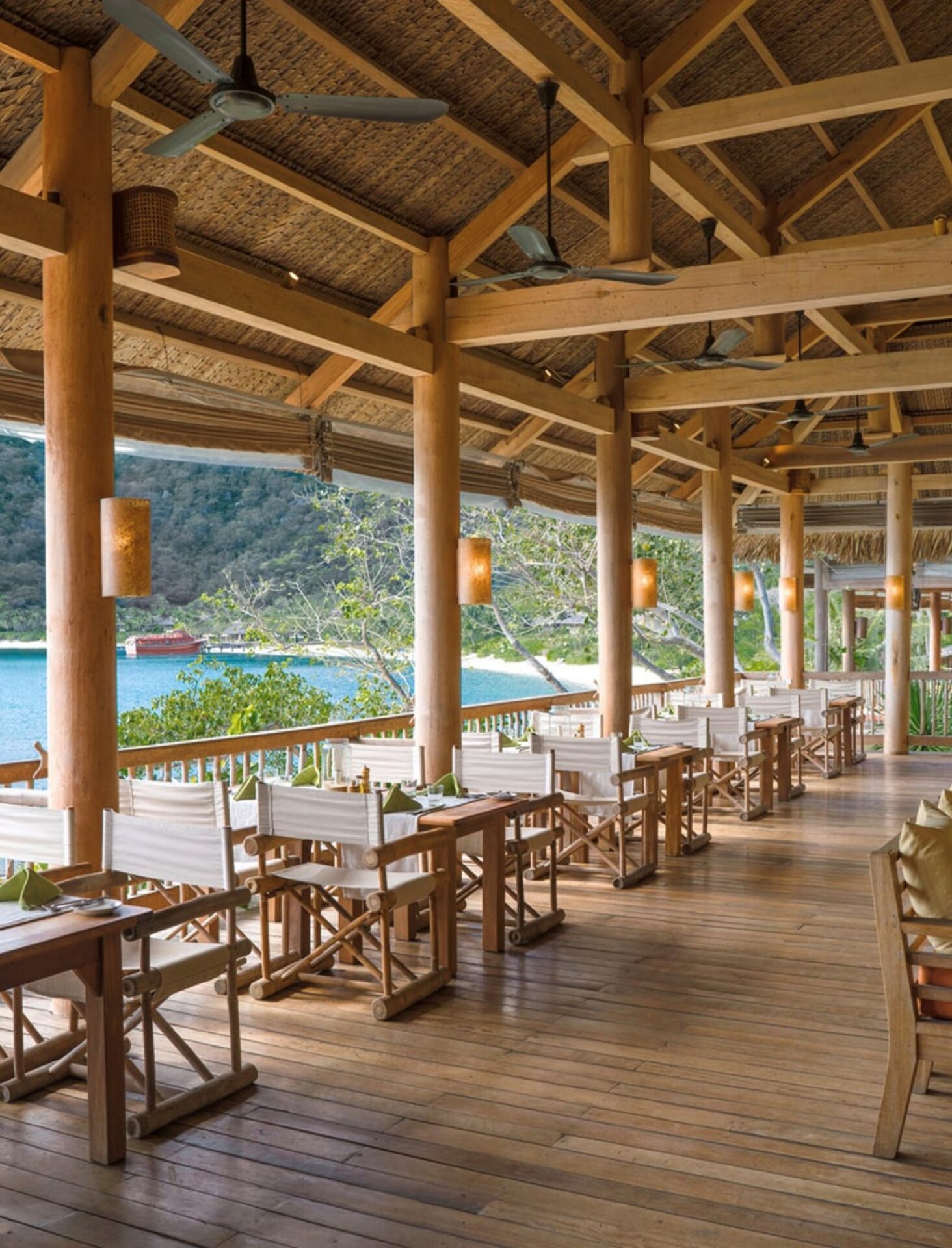 The President Villa is exceptional, located on rocks at one end of the bay, featuring its own pier and a vast swimming pool surrounded by wild boulders—truly fit for royalty. Notably, it is where British Prince Andrew chose to stay on a previous visit.
