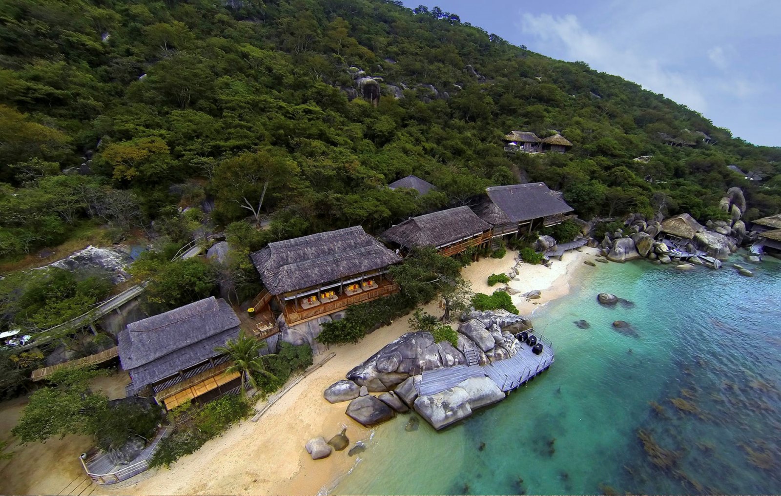 Six Senses Ninh Van Bay offers an unparalleled blend of luxury villas seamlessly integrated with lush jungles and grand granite boulders, all situated in an idyllic bay on a remote peninsula—complete with its own time zone. This resort epitomizes the quintessential rustic retreat.